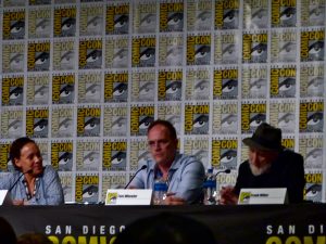 Desde hace unos años una de las cosas más populares qué hacer en el Comic Con es entrar a los páneles en donde se presentan las nuevas películas, series, caricaturas, y demás. Donde la gente pudo ver a Chris Hemsworth (Thor) por ejemplo, o la aparición sorpresa de Mark Hamill (Star Wars, voz Joker) y Taron Egerton (Rocketman, Kingsman), o el panel de Brooklyn 99 en donde la gente hizo fila por más de 3 horas (me consta porque mi sobrina y mi cuñado la hicieron), por nuestra parte entramos al panel de Cursed, la nueva serie y novela gráfica de Frank Miller y Thomas Wheeler. En donde Frank creador de la serie de 300, Sin City y Batman; Dark Knight Returns comentó sobre esten nuevo proyecto en donde abordan la historia muy conocida del Rey Arturo y su espada Excalibur, pero ahora bajo el nuevo universo creado por ambos. Será una novela y también una serie original de Netflix que está en producción por el momento. También estuvimos en el panel de la nueva serie de Epix llamada Pennyworth, que regresa el tiempo a los inicios de uno de los personajes más icónicos de la serie de Batman quién es Alfred Pennyworth, y habla sobre cómo un soldado británico se convierte en el mayordomo de la familia Wayne. Serie protagonizada por Jack Bannon (Imitation Game) quien interpreta a Alfred, Ben Aldridge (Our Girl) quien interpreta al papá de Batman; Thomas Wayne y a Paloma Faith quien será la villana de esta serie.